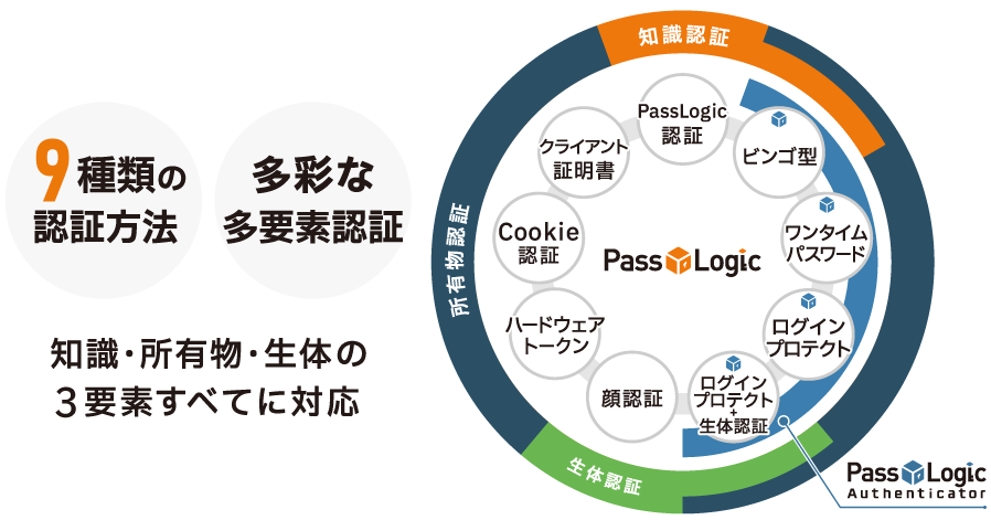 PassLogicは、知識・所有物・生体の認証3要素すべてに対応した多要素認証ソリューションです。