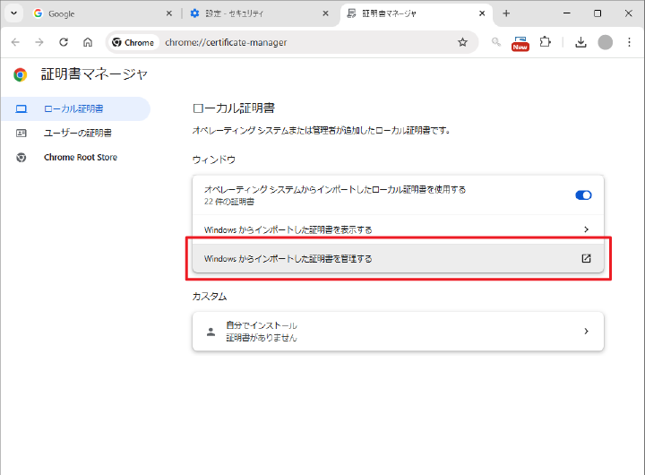 ※ローカル証明書・ユーザーの証明書どちらのメニューにも「Windowsからインポートされた証明書を管理する」は選択できます。