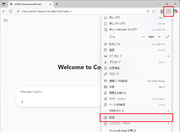 1.Edge右上のメニューを開き、「設定」をクリックします。