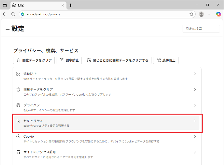 3.「プライバシー、検索、サービス」項目の中の「セキュリティ」をクリックします。