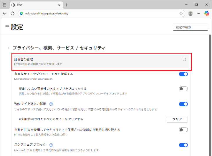 4.「プライバシー、検索、サービス/セキュリティ」項目の中の「証明書の管理」をクリックします。