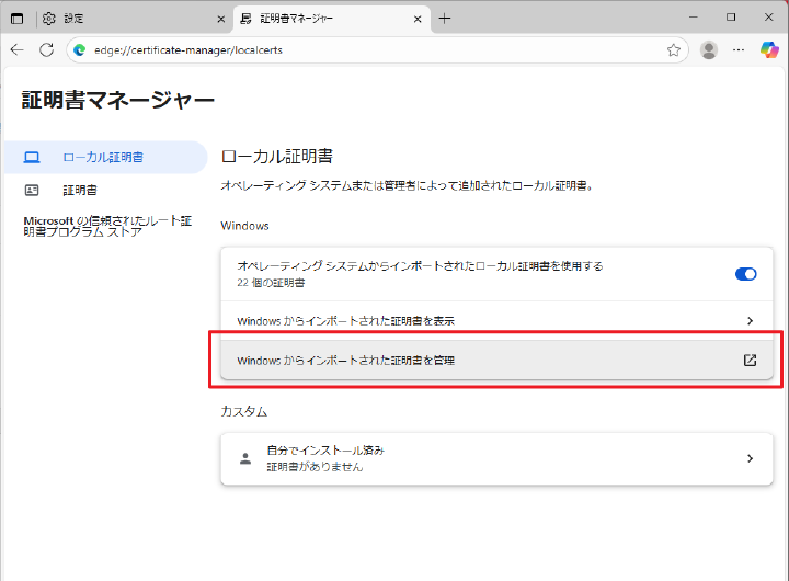 ※ローカル証明書・証明書どちらのメニューにも「Windowsからインポートされた証明書を管理」は選択できます。