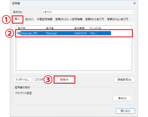 6.①「個人」タブをクリックし、②削除する証明書を選択して、③「削除」をクリックします。