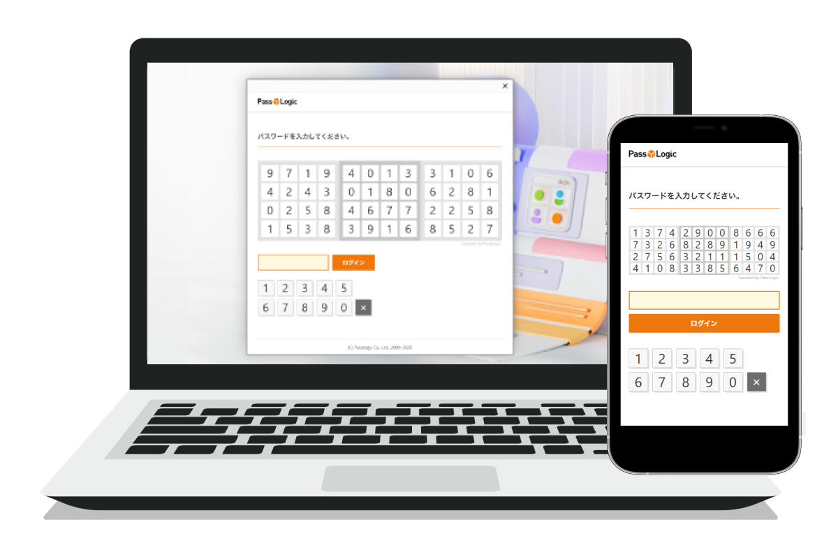 ※Bridge M365では、PassLogic認証(マトリックス方式)による完全デバイスレスの認証方法に加え、スマートフォン(PassLogic Authenticator)やハードウェアトークンを使用した認証方法にも対応しています。