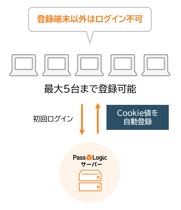 利用者が初回ログインを行うと、その端末にCookie値が自動で登録されます。次回以降のログインでは、初回ログインで登録された端末以外からのログインを受け付けなくなります。