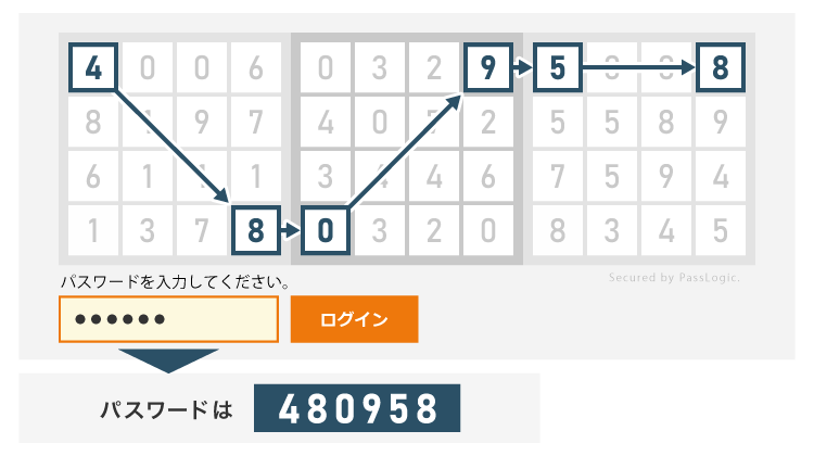 ログイン画面のマトリックス表に乱数が表示されます。事前に設定したパターンに沿って数字を読み取ることで、ワンタイムパスワードとして使用できます。