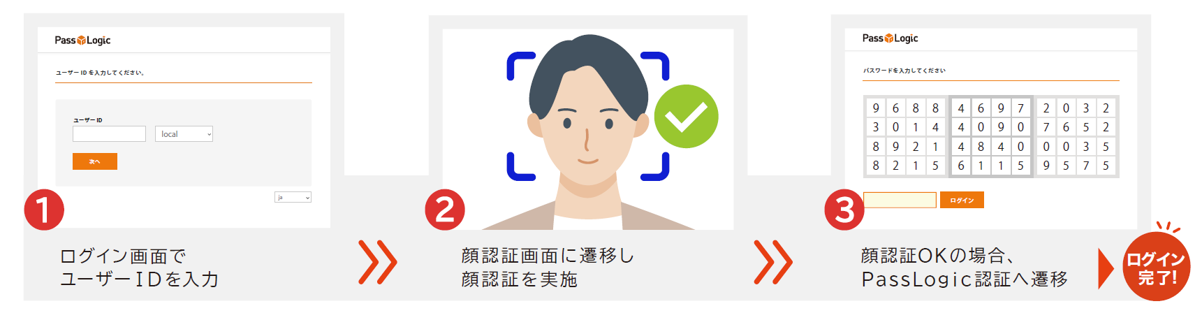 従来の顔認証を使った多要素認証では、固定パスワードとの併用が一般的でしたが、本ソリューションでは、顔認証とPassLogic 認証(マトリックス方式)による「覚えているパターン」を組み合わせることで、トークンや固定パスワード、専用機器やアプリを使わず、ブラウザだけで高度な多要素認証が可能です。