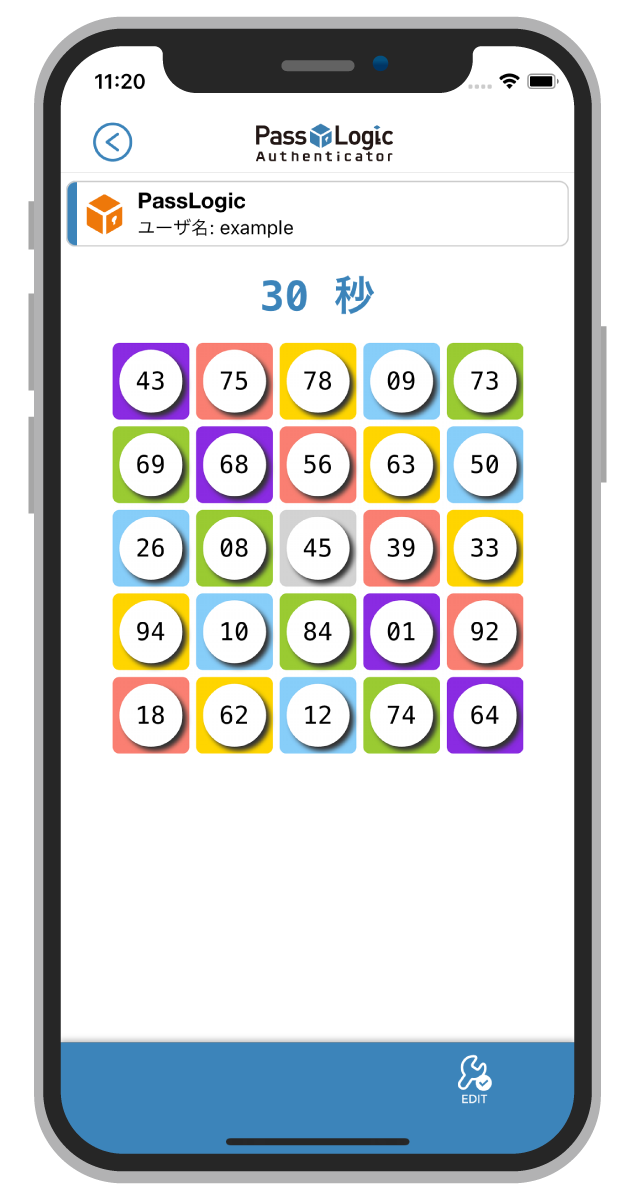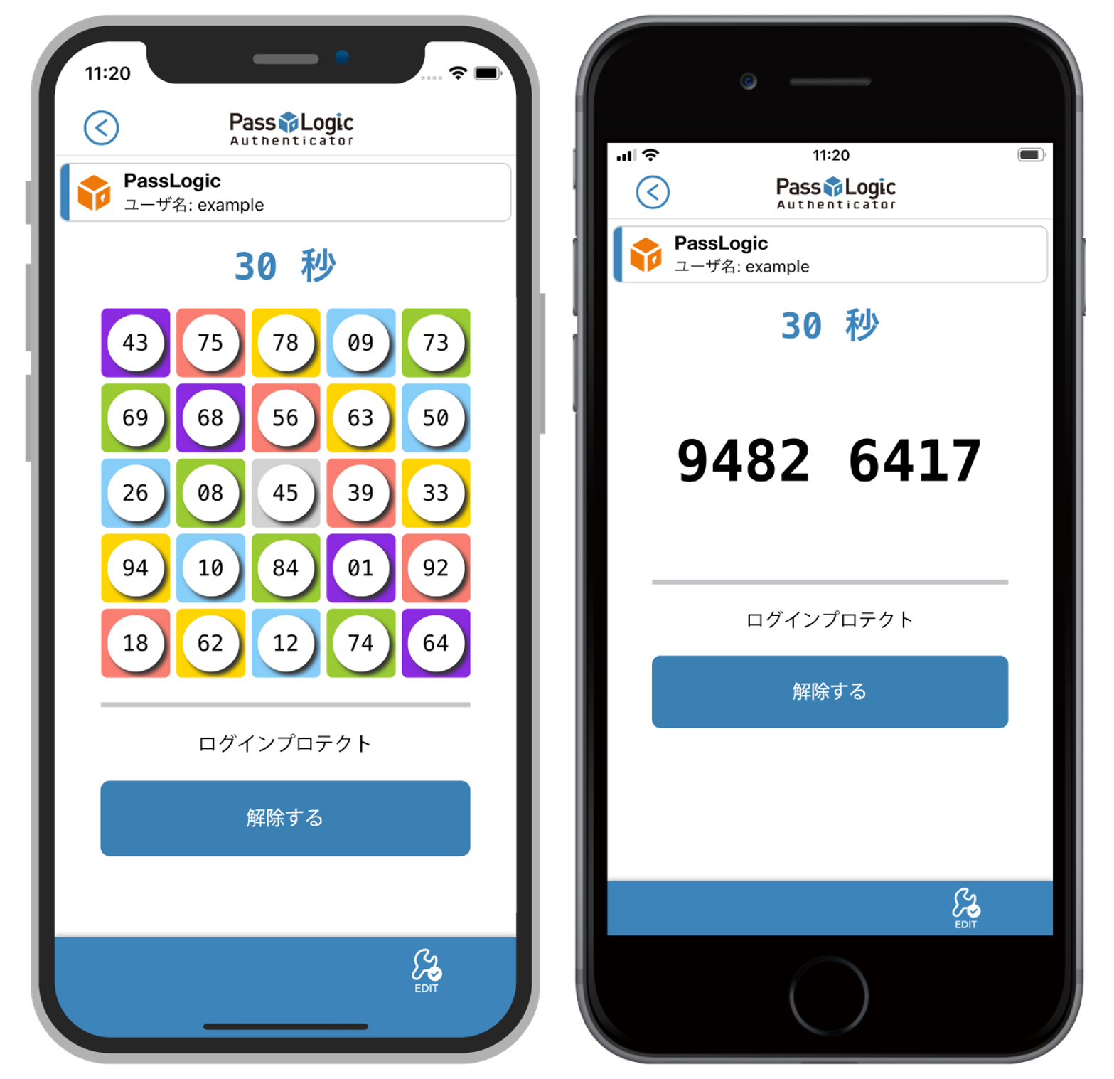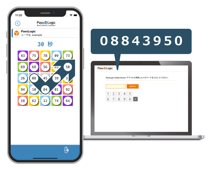 一定の時間で変化するワンタイムパスワードを生成する機能を搭載した専用モバイルアプリ「PassLogic Authenticator」を利用します。