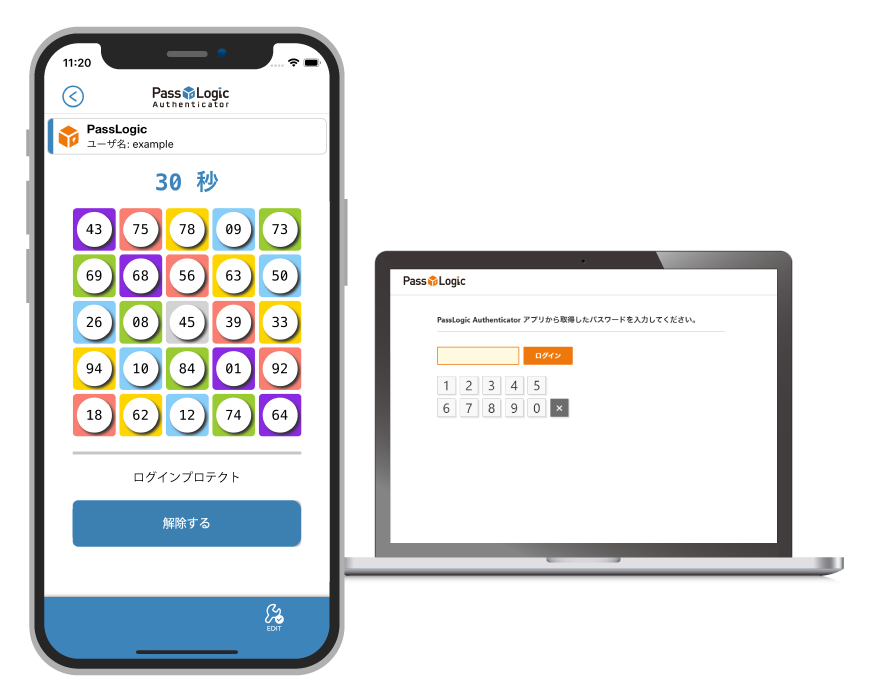 一定の時間で変化する「ワンタイムパスワード」を生成する機能に加え、パスロジック方式の「ビンゴ型表示」に対応しています。また、ログイン時以外は常にロックがかかり、60秒のみロックを解除する「ログインプロテクト」「ログインプロテクト+生体認証」の機能を提供します。