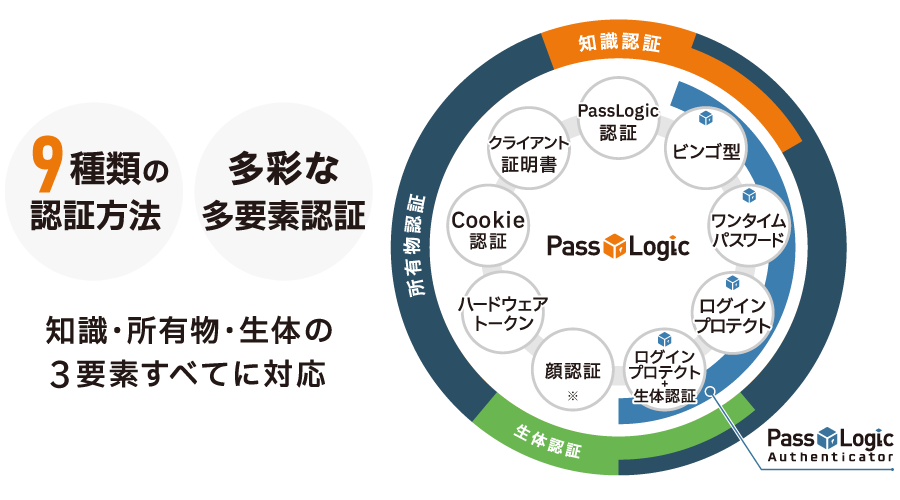 PassLogicでは、9種類の認証方法を組み合わせて、多彩な多要素認証を提供しています。PassLogic認証や、PassLogic Authenticator ビンゴ型などの「知識認証」と、クライアント証明書や、ログインプロテクト、PassLogic Authenticator ワンタイムパスワード、ハードウェアトークンの「所有物認証」をご要件に応じて選択いただけます。Windows OSの認証強化にも適用可能です。