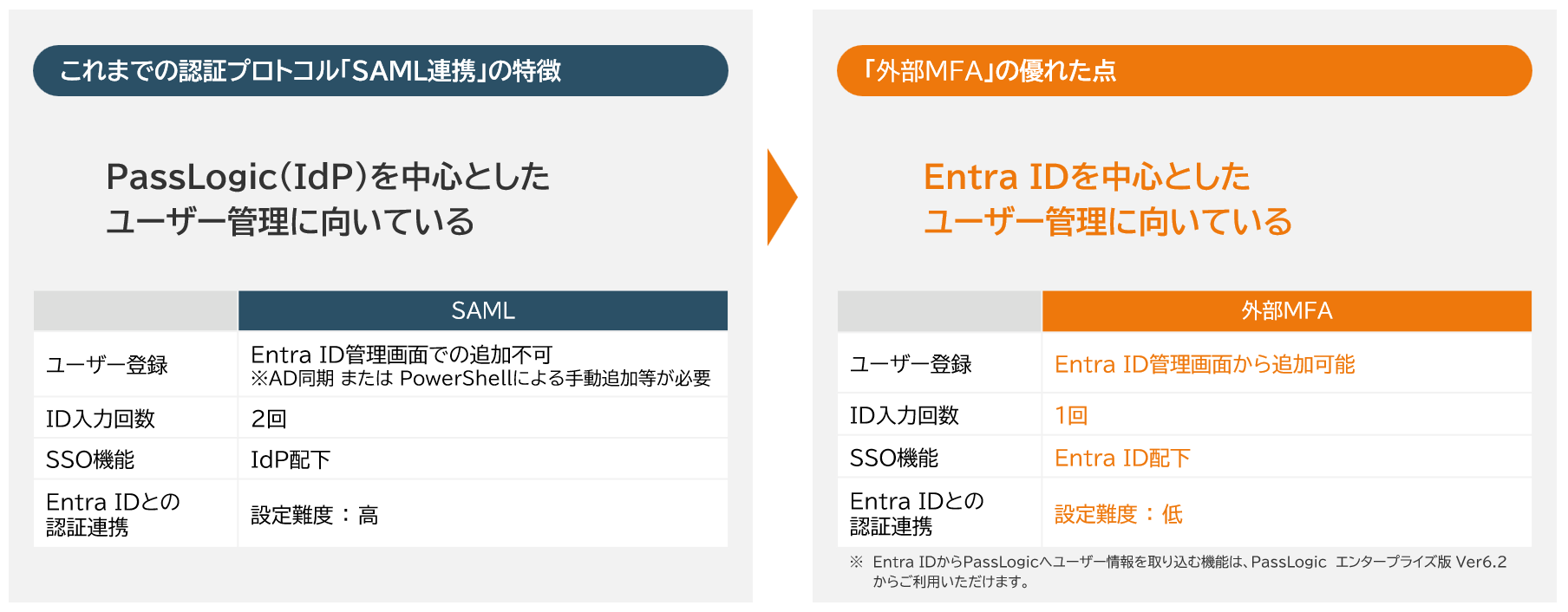 Entra IDの外部MFAとの連携を採用するBridge M365では、Microsoft 365に登録したユーザー情報をPassLogic認証でも利用できるため、SAML連携に比べてユーザー管理に伴う運用負荷を大幅に軽減できます。
