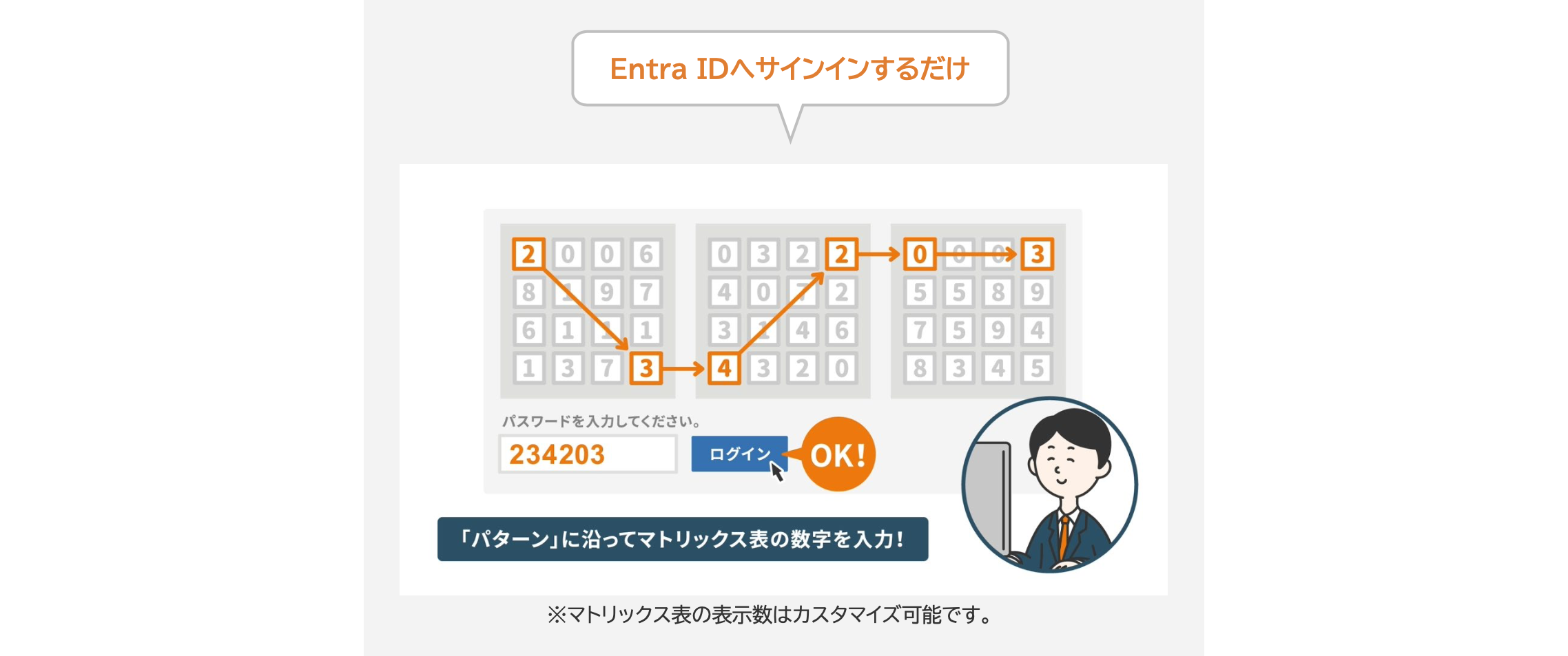 ユーザーは、乱数を配置したマトリックス表から、自分で決めたパターンに沿って数字を読み取るワンタイムパスワードを利用してEntra IDにサインインします。マスの位置と順番を覚えておくだけで、強力なワンタイムパスワードによるログインが可能です。パスワードを忘れてしまうといった心配もありません。