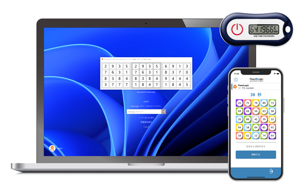 職員へのデバイス配布を行わない実運用に即し、専用モジュールによってOSサインイン時にマトリックス方式(単要素での認証強化)を適用できます。これにより、配布コストをかけずに全層での「固定パスワード運用」からの脱却を実現し、なりすましや端末紛失時の不正利用リスクを低減する、自治体実務に即した最適設計が可能です。また、認証方法としてマトリックス方式のほかにハードウェアトークンや専用スマートフォンアプリのPassLogic Authenticatorも利用可能です。